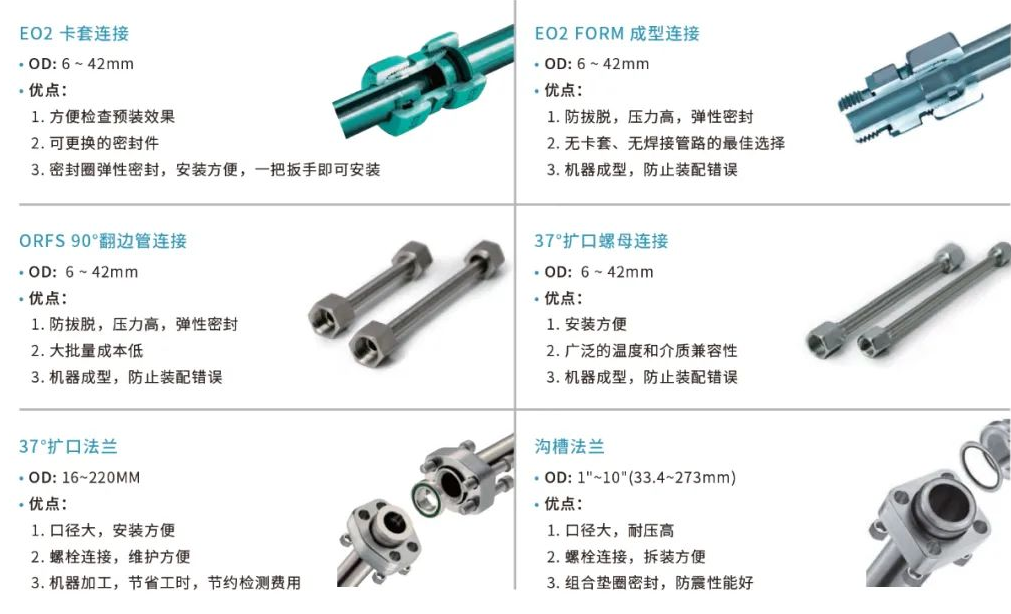 管路的連接形式有多種可選,例如EO形式單卡套,EO2卡套,EO2FORM成型,37°擴口,90°ORFS翻邊成型,管路連接均采用無焊接的連接方式,保證管路的清潔度和可靠性。