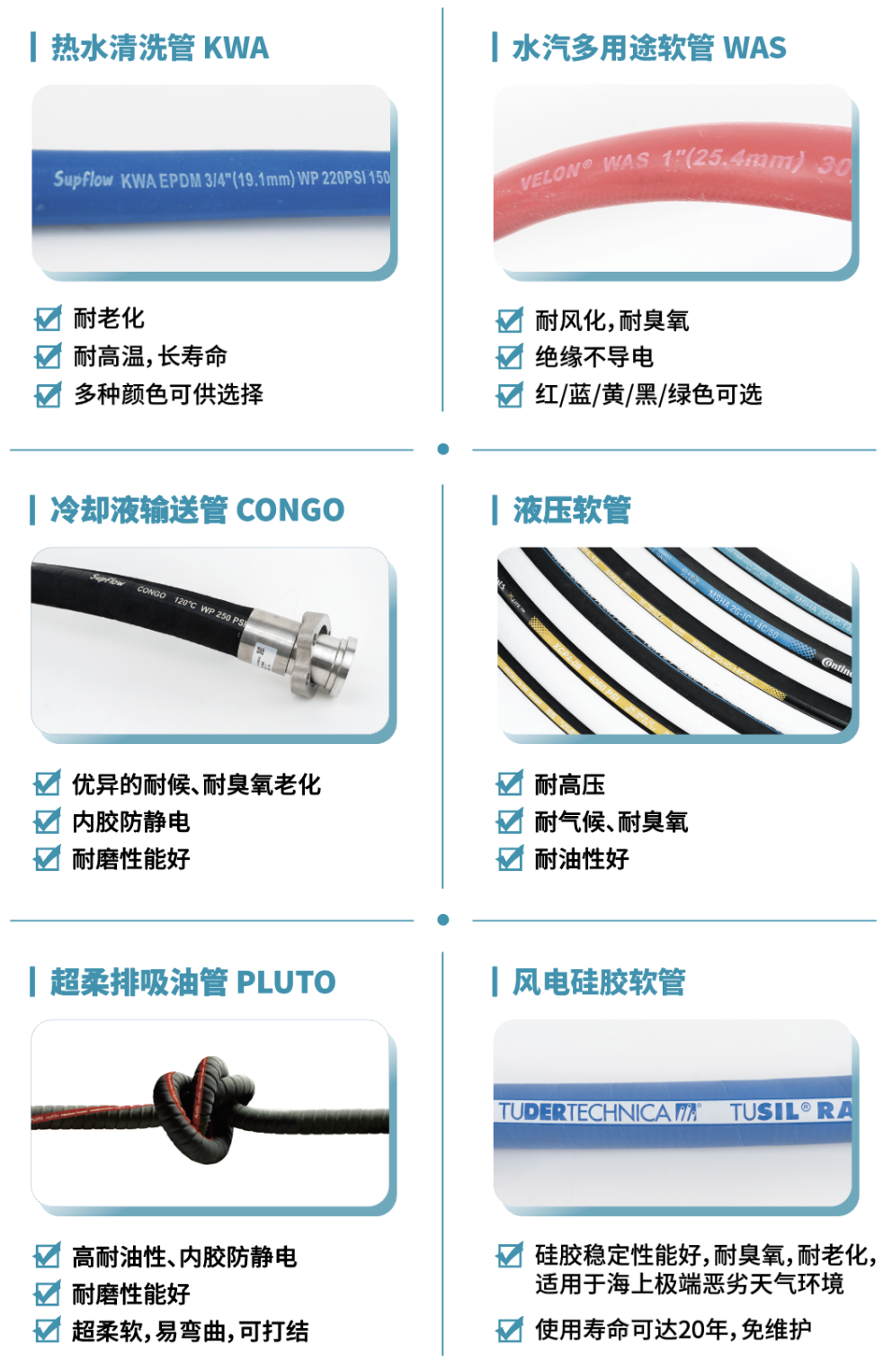 可提供滿足各大船級社認證要求的液壓軟管總成,軟管經(jīng)過嚴格的壓力測試和熱油沖洗出廠;還有適用于風電發(fā)電機冷卻系統(tǒng)中的防凍液輸送以及風機中的乙二醇冷卻等應(yīng)用場景的排吸軟管;還可以提供易彎曲,可打結(jié),內(nèi)膠可防靜電的超柔油管等。