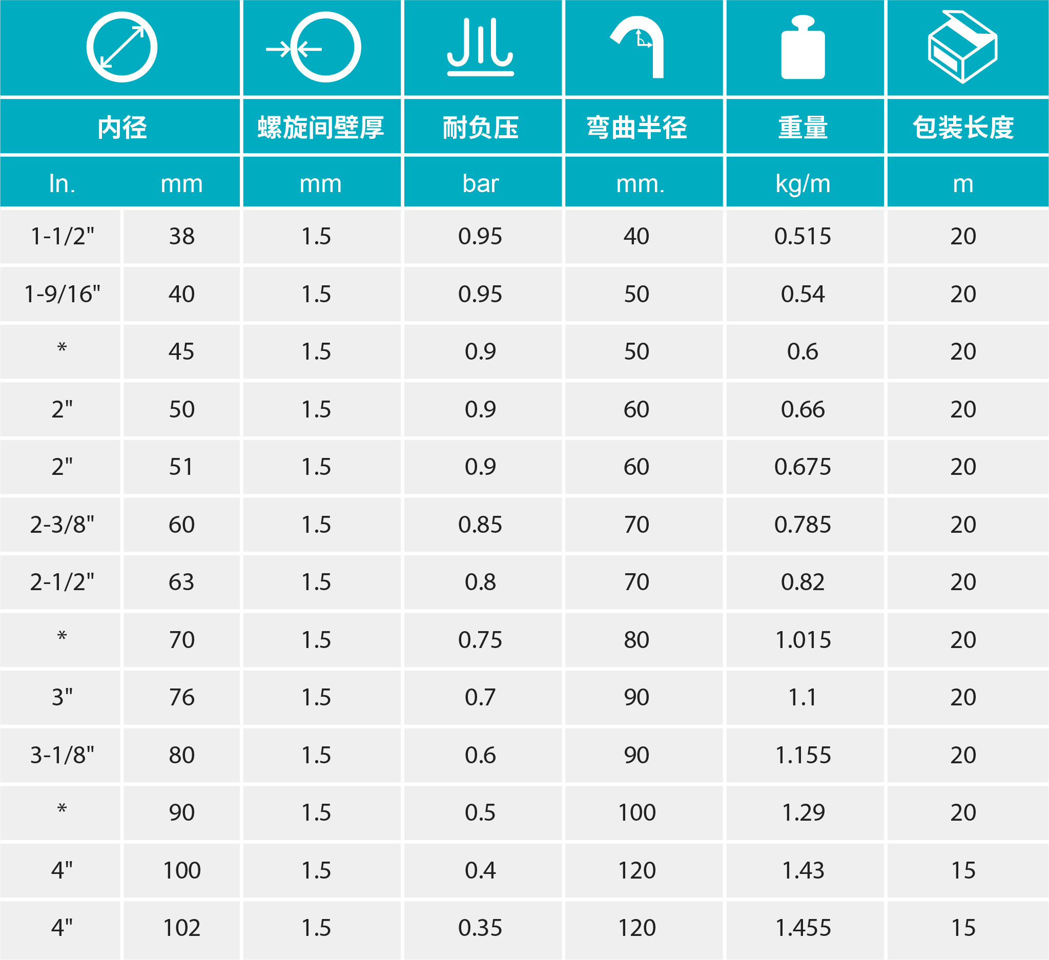 - 不同尺寸的軟管其螺旋間壁厚均為1.5mm