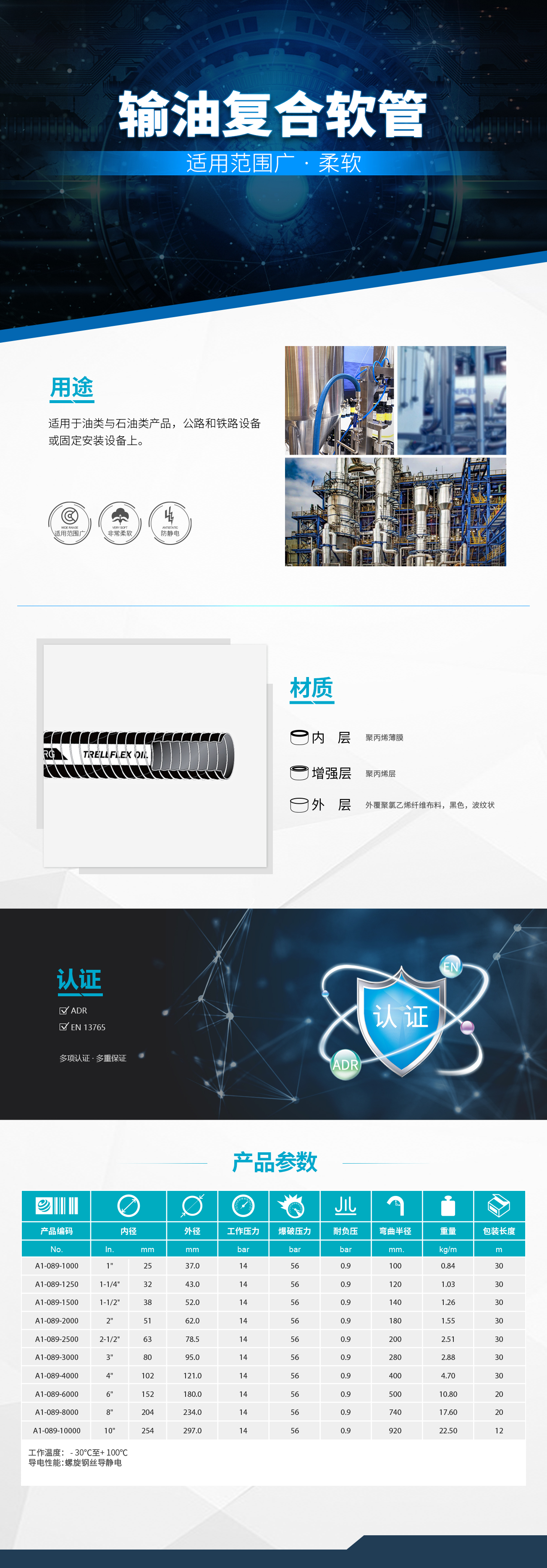 - 使用于大部分石油產(chǎn)品,良好的彎曲半徑,鋼絲導(dǎo)靜電