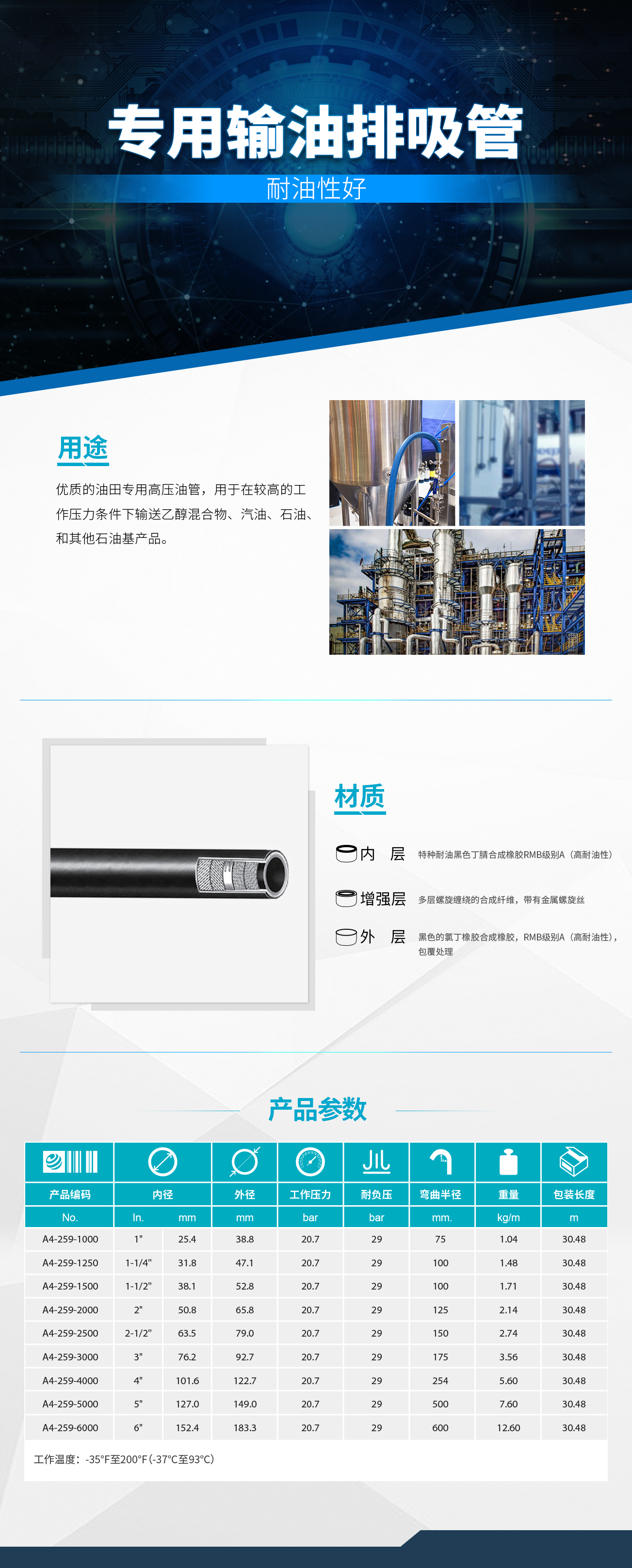 - 本膠管產(chǎn)品,可用于汽油、石油、乙醇混合物,以及其他的芳烴含量可達50%的石油基產(chǎn)品的罐車和廠內(nèi)輸送作業(yè)。本品的設(shè)計上可用于壓力、自重和全面的抽吸作業(yè)。