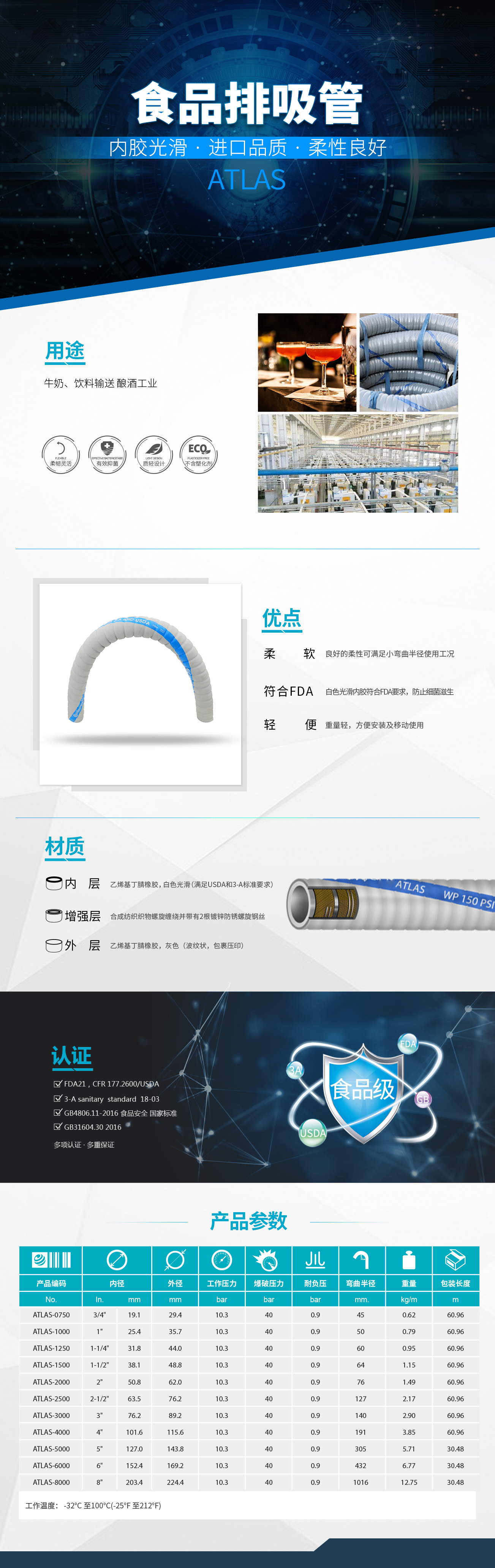 - 輕質(zhì)且非常柔韌的食品管,可用于食品物質(zhì)如牛奶,飲料等的重力流、壓力流和抽吸流的輸送。推薦用于釀酒工業(yè)專用輸送軟管。