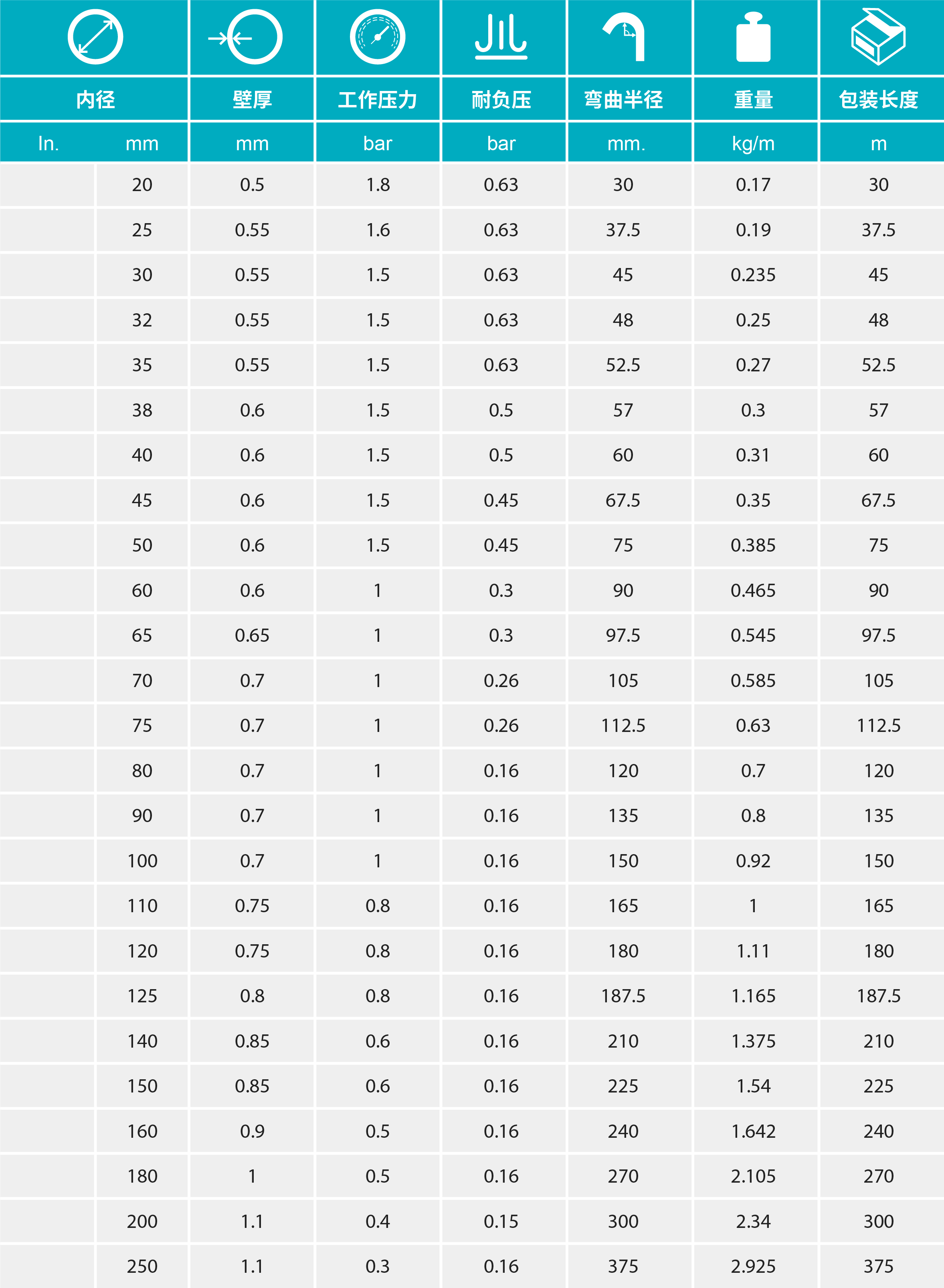 - 質(zhì)極輕且具有良好的柔韌性,內(nèi)壁平滑以保證物料在管內(nèi)流動(dòng)順暢