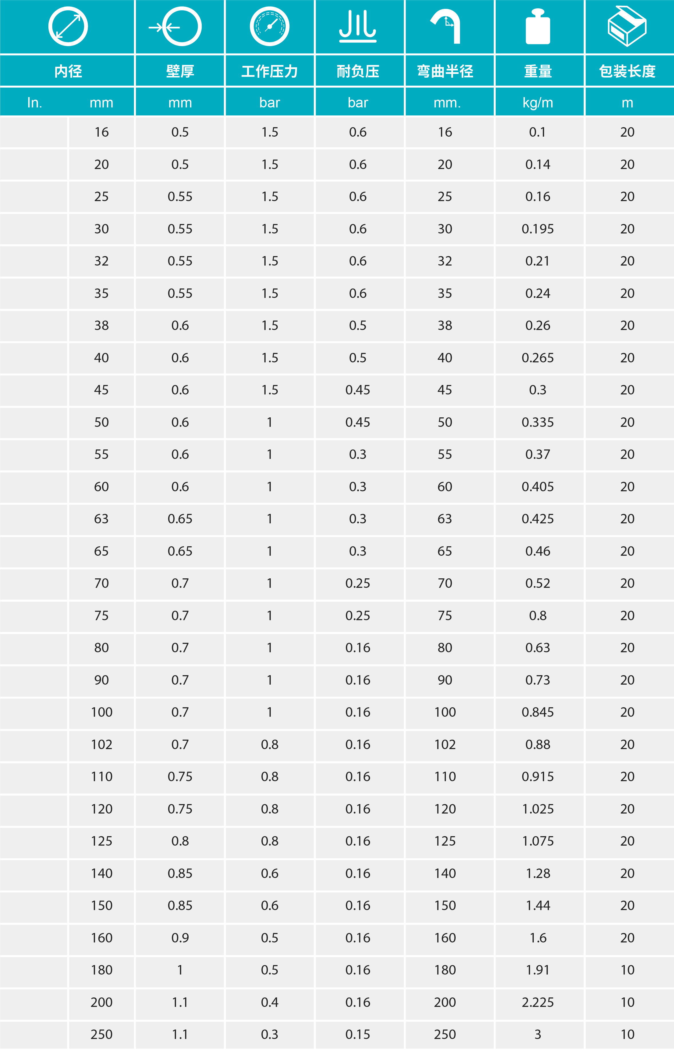 - 質(zhì)極輕且具有良好的柔韌性,內(nèi)壁平滑以保證物料在管內(nèi)流動順暢