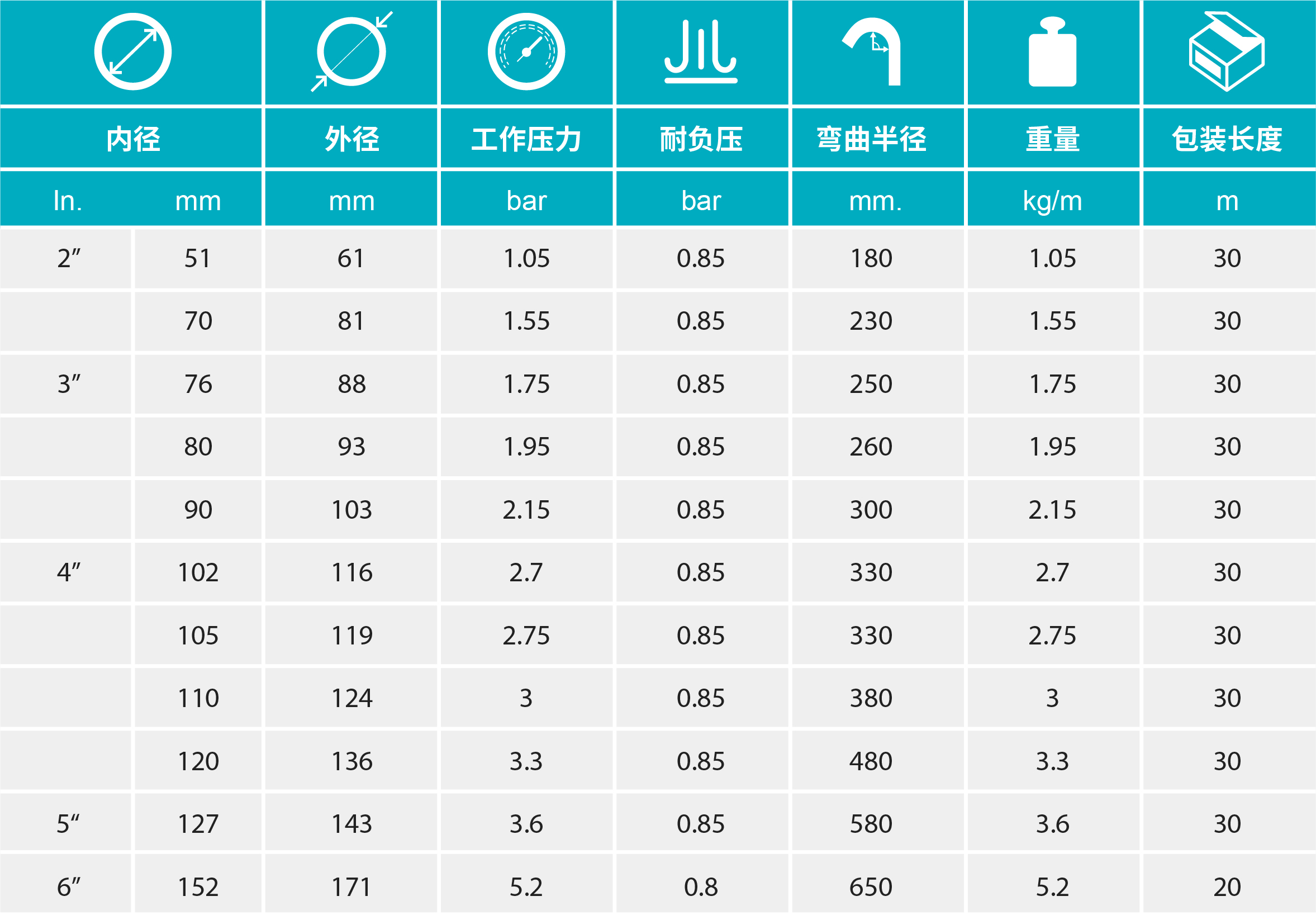 用于低溫度的中型排吸工況,可用于農(nóng)業(yè)灌溉、供水、罐車等,耐低溫、柔韌性好