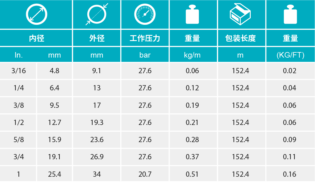 - 在300 psi的工作壓力條件下,與push-on配件配合使用.用于低壓液壓、啟動輸送系統(tǒng),如機器人系統(tǒng)、車間氣源系統(tǒng)、一般性工業(yè)作業(yè)、維護性作業(yè)和汽車裝配等方面的用途。本品具有絕緣性,在1000伏直流電的條件下,膠管上每英寸長度的最小電阻大于1兆歐姆。