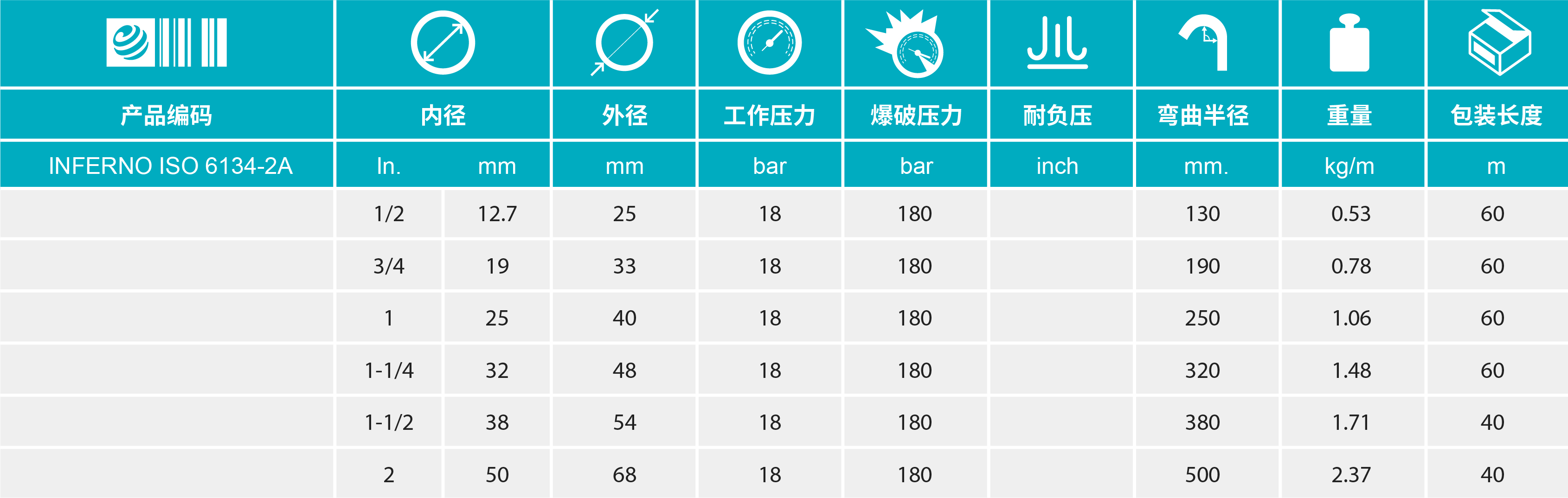 - 標準長度:內(nèi)徑13 mm, 19 mm, 25 mm 和 32 mm: 60m ; 其他尺寸: 40m
