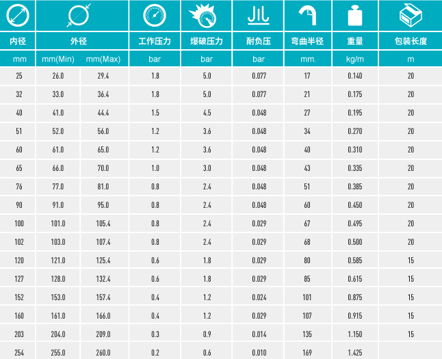 - 所有口徑非螺旋處恒定壁厚0.5mm,TPU與特殊材質(zhì)復(fù)合制成使得管壁永久導(dǎo)靜電(R<〖10〗^8Ω),耐微生物和耐水解,抗紫外線