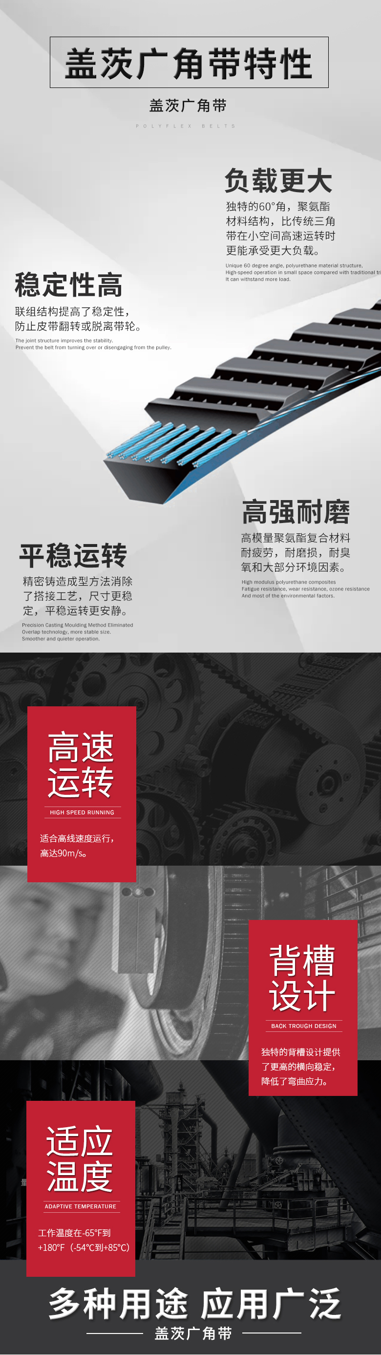 - 聯(lián)組皮帶結(jié)構(gòu)增加了皮帶的穩(wěn)定性,防止皮帶翻轉(zhuǎn)和跳出槽輪。