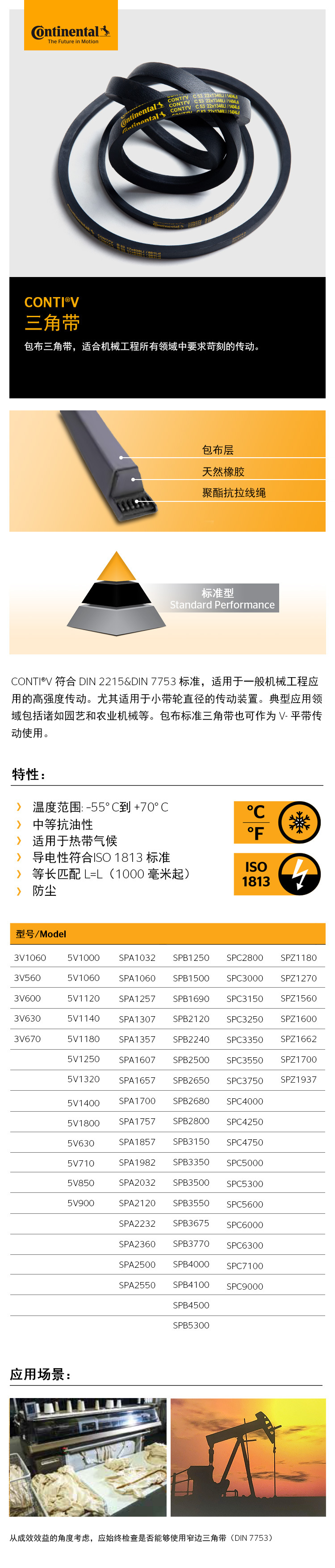 - CONTI V 符合DIN 2215&DIN7753標(biāo)準(zhǔn),適用于一般機(jī)械工程應(yīng)用的高強(qiáng)度傳動(dòng)。尤其適用于小帶輪直徑的傳動(dòng)裝置。典型應(yīng)用領(lǐng)域包括諸如園藝和農(nóng)業(yè)機(jī)械等。包布標(biāo)準(zhǔn)三角帶也可以作為V-平帶傳動(dòng)使用
