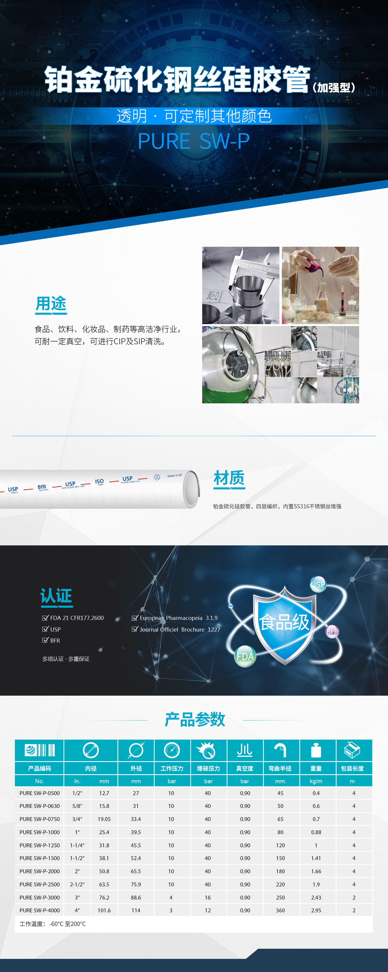 - 鉑金硫化硅膠管,4層編織,內(nèi)置 SS316 不銹鋼絲增強(qiáng)