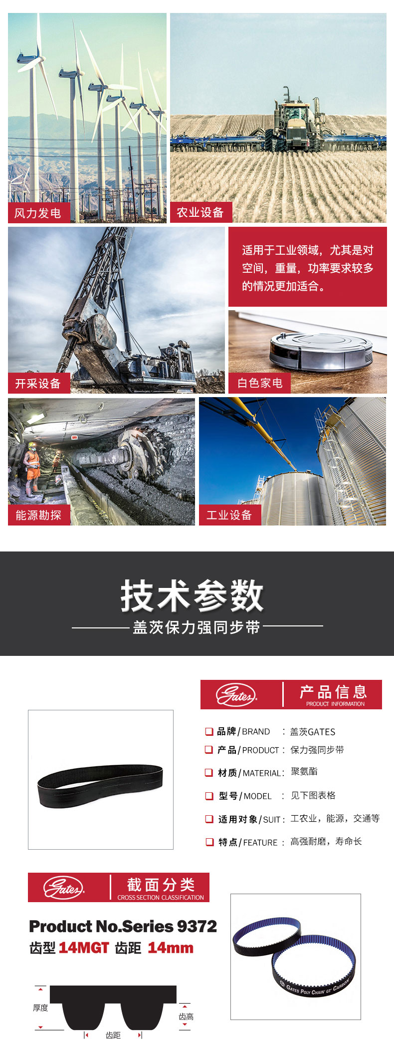 - 蓋茨專有的圓弧齒形結(jié)構(gòu)提供了更高的剪切力,減小了噪音,提高了傳動(dòng)功率。