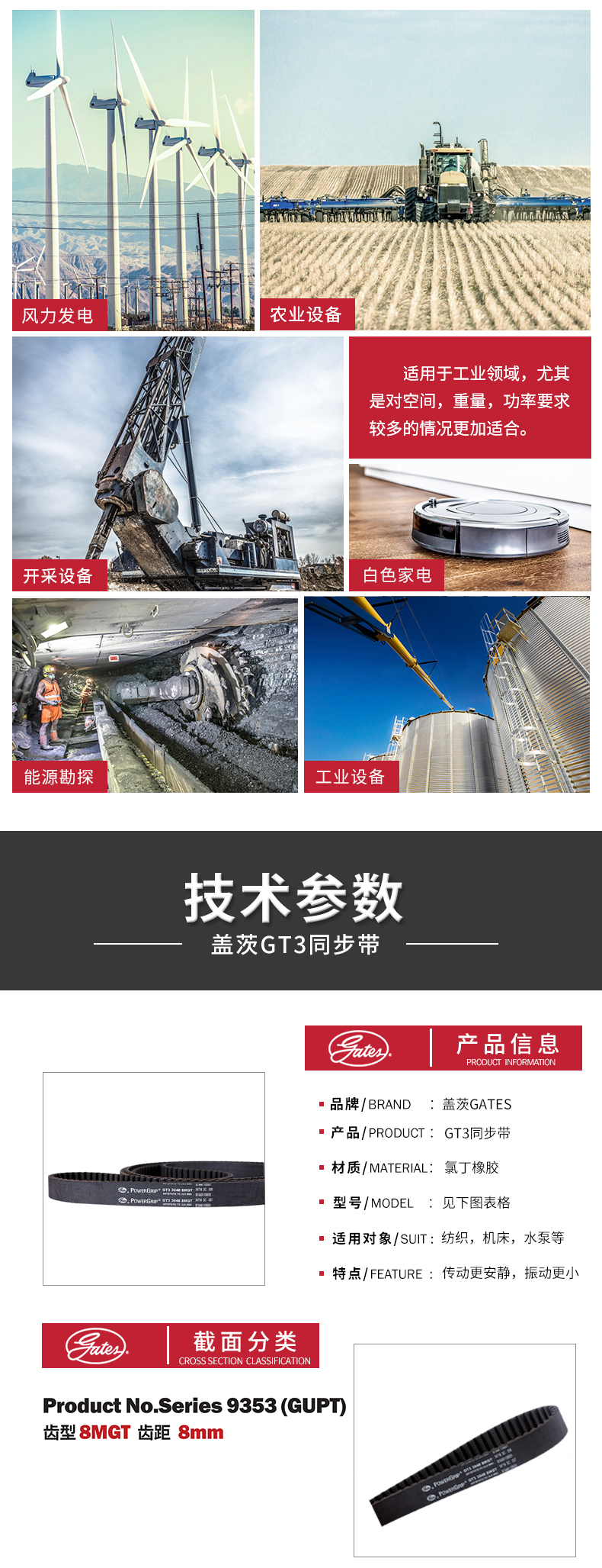 蓋茨的齒型結構可和對應帶輪匹配,帶輪和皮帶齒的高度嚙合能夠提高其傳動精度,降低運行噪音。