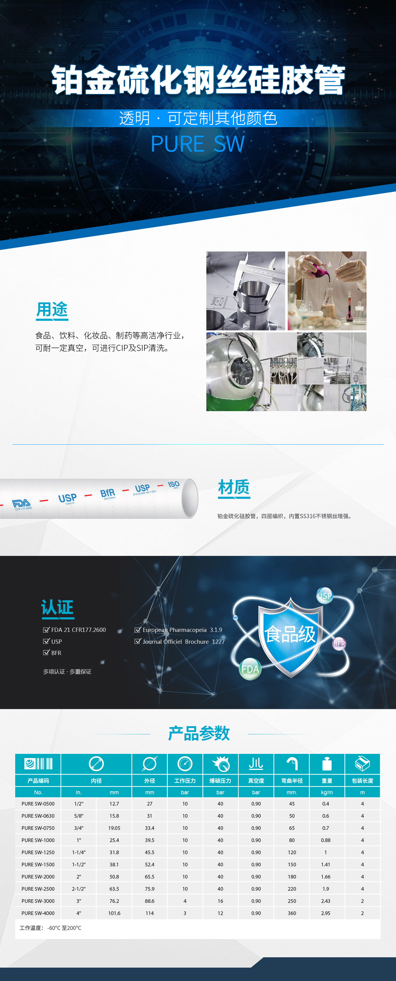 鉑金硫化硅膠管,4層編織,內(nèi)置 SS316 不銹鋼絲增強(qiáng)