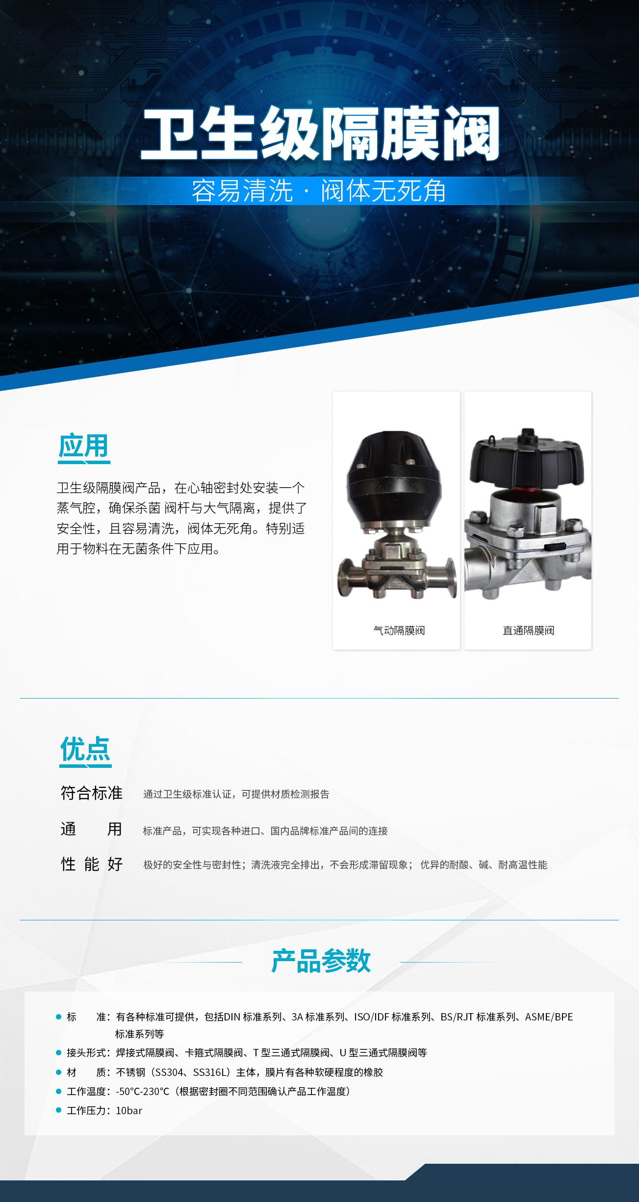 - 衛(wèi)生級隔膜閥產品,在心軸密封處安裝一個蒸氣腔,確保殺菌閥桿與大氣隔離,提供了安全性,且容易清洗,閥體無死角。特別適用于物料在無菌條件下的應用。