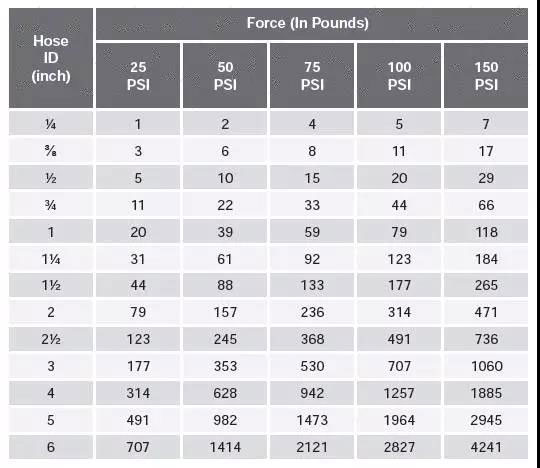 什么是末端力:這里末端力指的是沿著軸向作用在末端的動能,這個力也就是卡箍為了防止接頭從軟管脫離而提供的足夠的力。初中的物理告訴我們,壓力=壓強(qiáng)x截面積(F = Px S),壓強(qiáng)就是我們平時所說的軟管的工作壓力(大家叫壓力其實錯誤的,但是我們已經(jīng)叫習(xí)慣了),截面積是軟管的內(nèi)徑的截面積。請看下表: