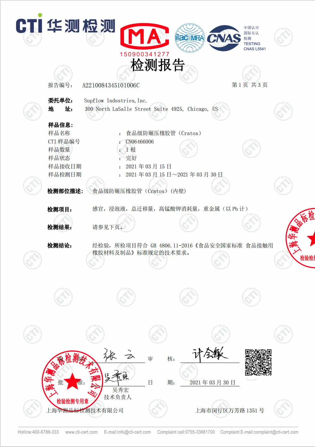 CRATOS符合GB4806.11-2016、GB31604.30-2016、GB9685-2016、FDA 21CFR 177.2600等相關法規(guī)和認證。