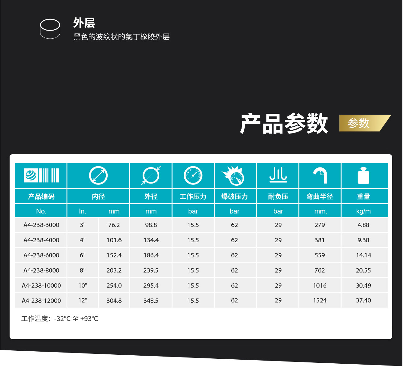 【內(nèi)層】Nitrile橡膠:可輸送芳香類成份達(dá)50%的石油,或氟橡膠:可輸送含芳香類物質(zhì)達(dá)100%的石油
