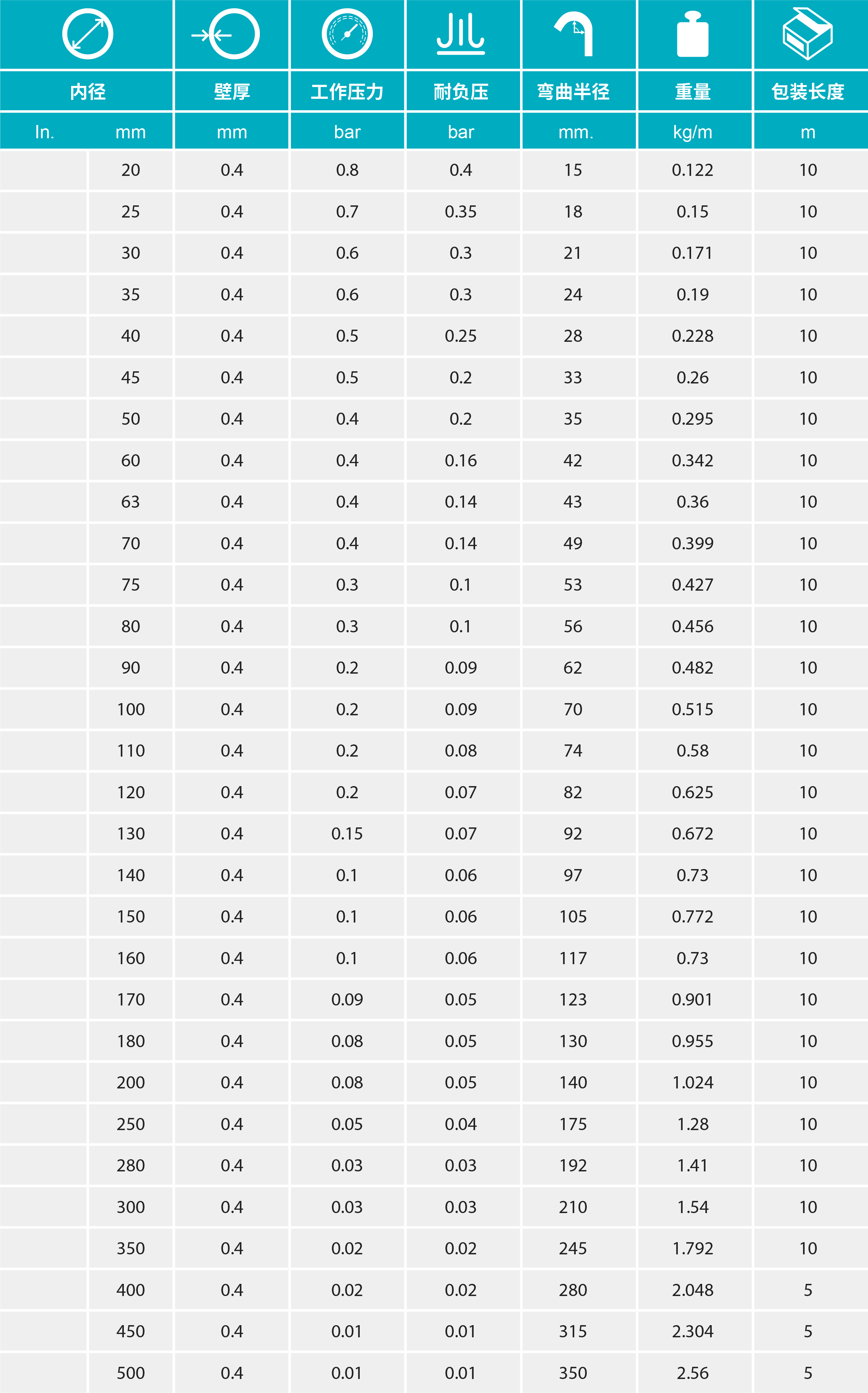 - 質(zhì)極輕且具有良好的柔韌性,內(nèi)壁平滑以保證物料在管內(nèi)流動(dòng)順暢