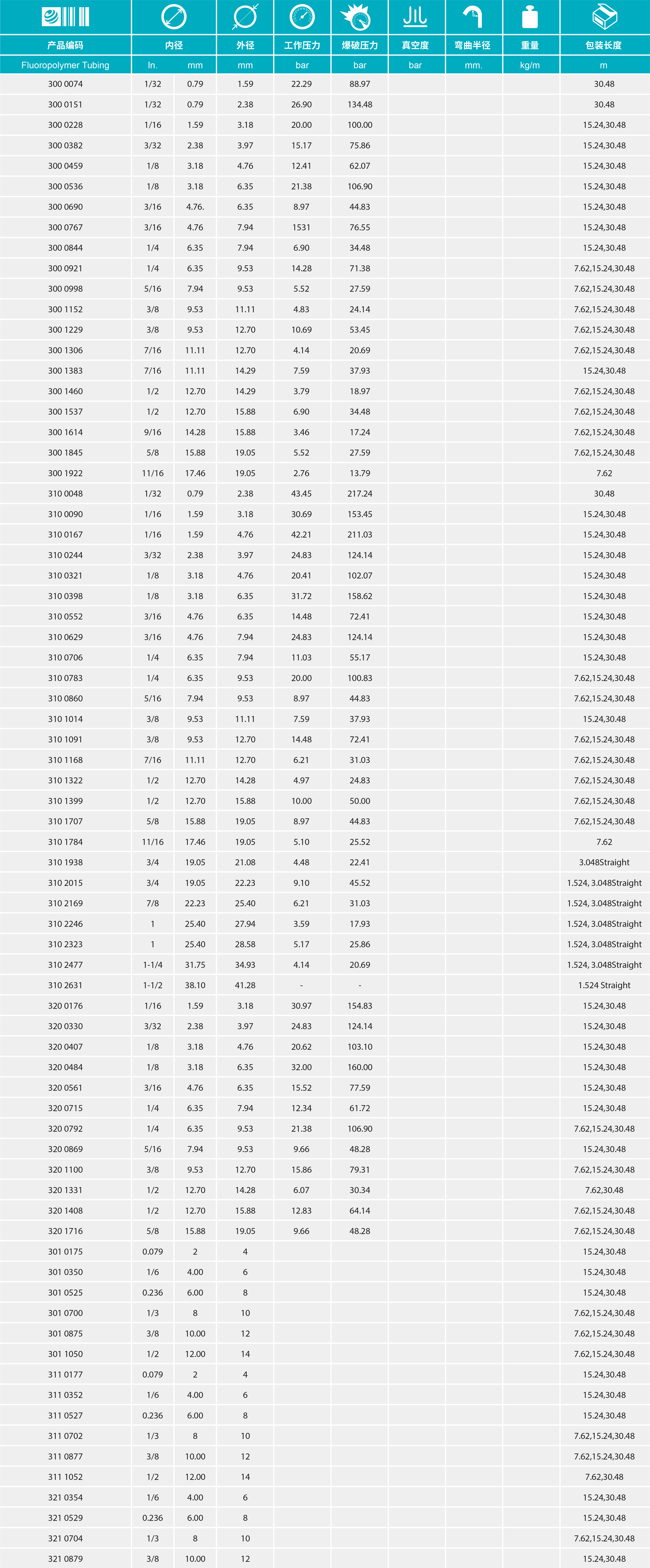 - 最大持續(xù)工作溫度:PTFE:500℉ FEP:400℉ PFA: 500℉