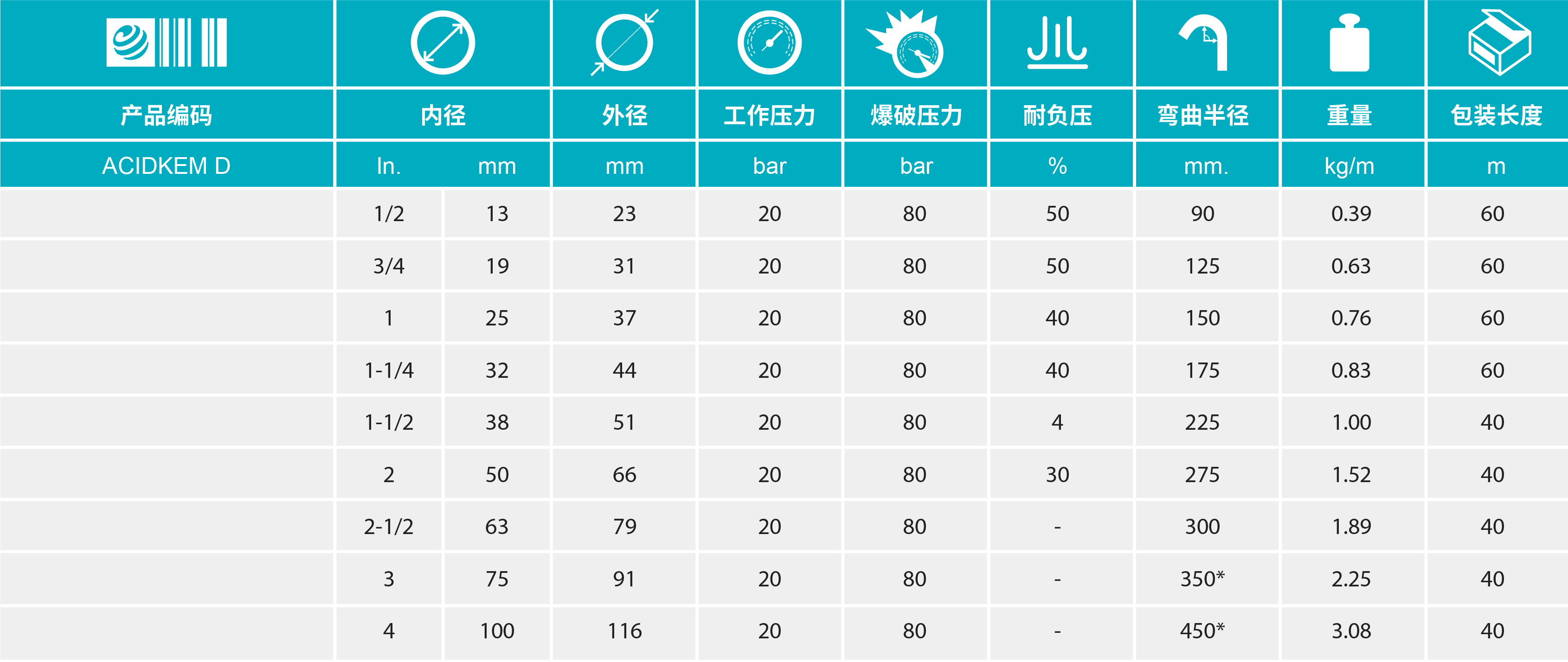 - 標(biāo)準(zhǔn)長度:內(nèi)徑13 mm, 19 mm, 25 mm and 32 mm:60m; 其他尺寸長度: 40m