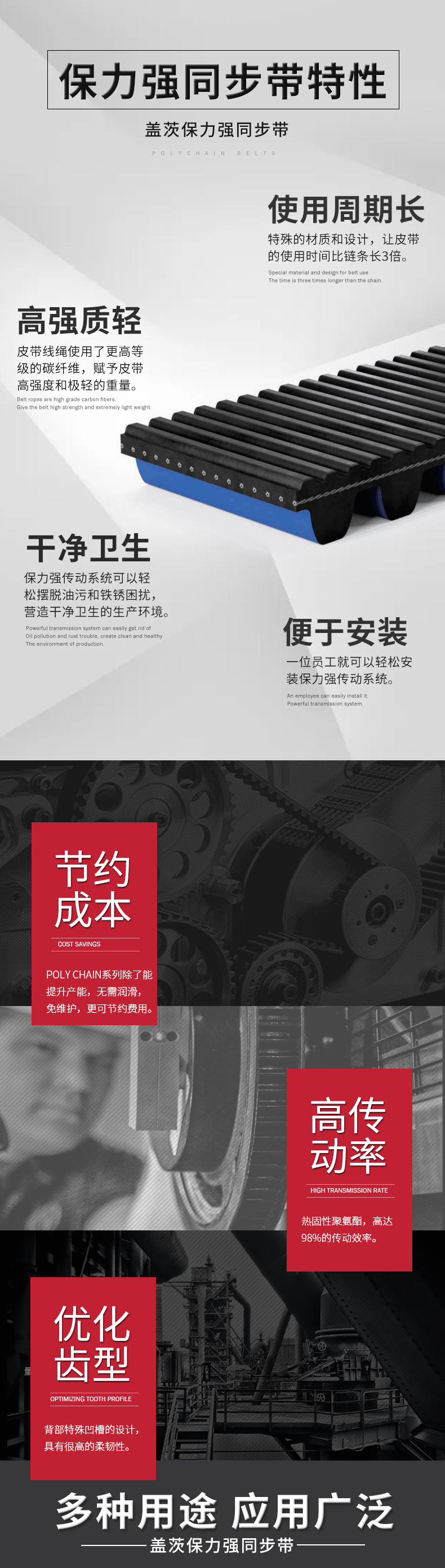 - 適用于工業(yè)市場應(yīng)用,特別適合于替換鏈條。主要用于高扭矩的傳動(dòng)系統(tǒng)中。