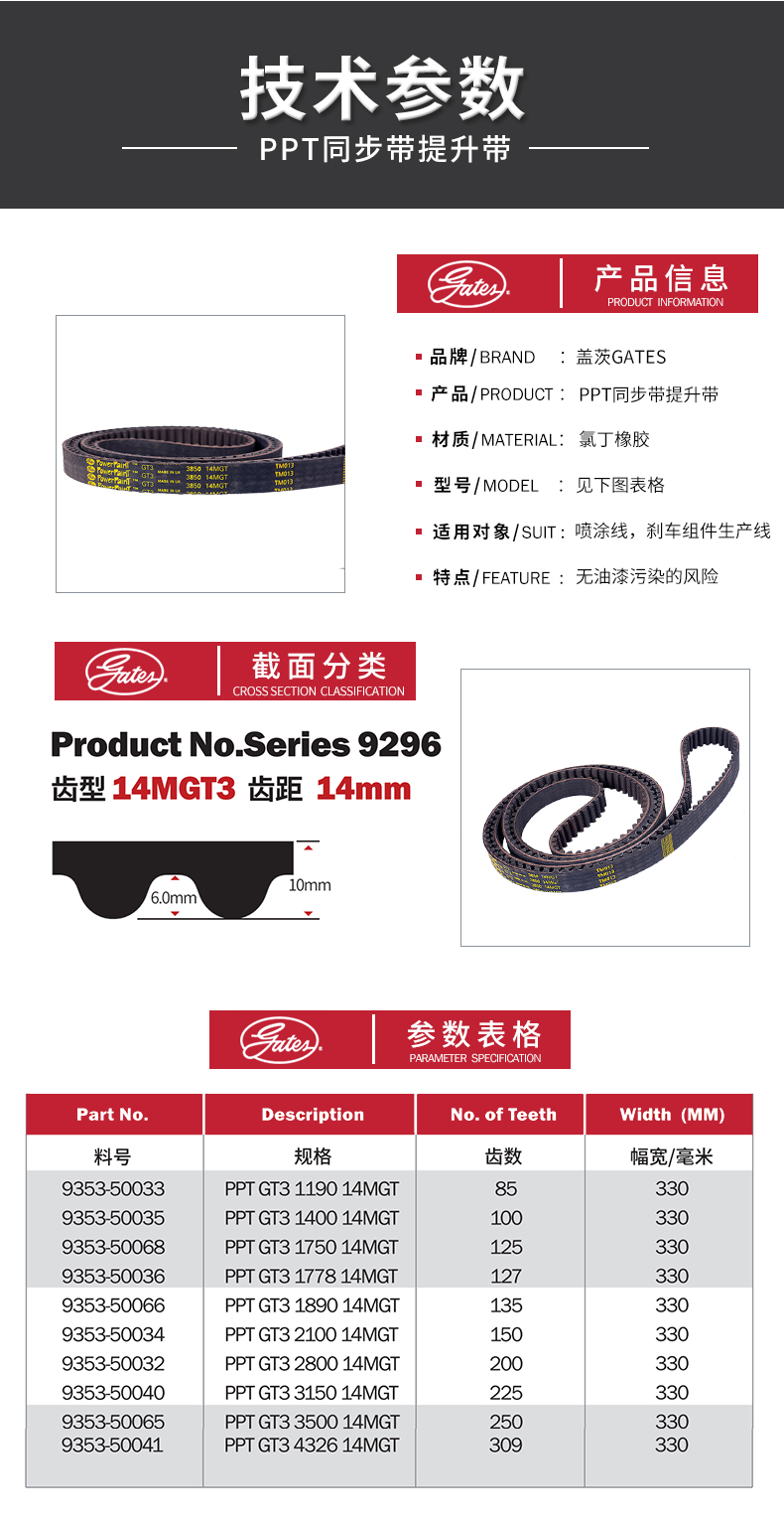 - 蓋茨GATES同步帶提升帶PowerPaint橡膠傳動(dòng)帶PPT GT3 3500 14MGT