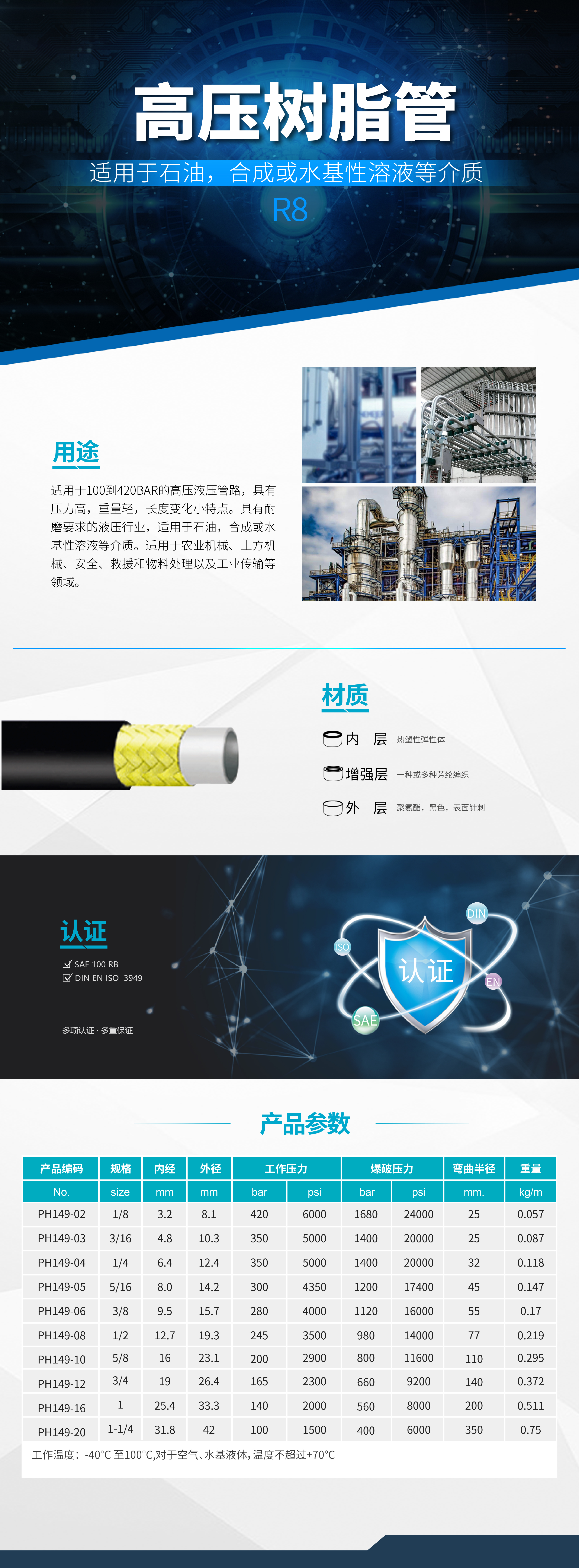 - 適用于100到420bar的高壓液壓管路,具有壓力高,重量輕,長度變化小等特點。具有耐磨要求的液壓行業(yè),適用于石油,合成或水基性溶液等介質(zhì)。適用于農(nóng)業(yè)機(jī)械、土方機(jī)械、安全、救援和物料處理設(shè)備以及工業(yè)氣體傳輸?shù)阮I(lǐng)域。