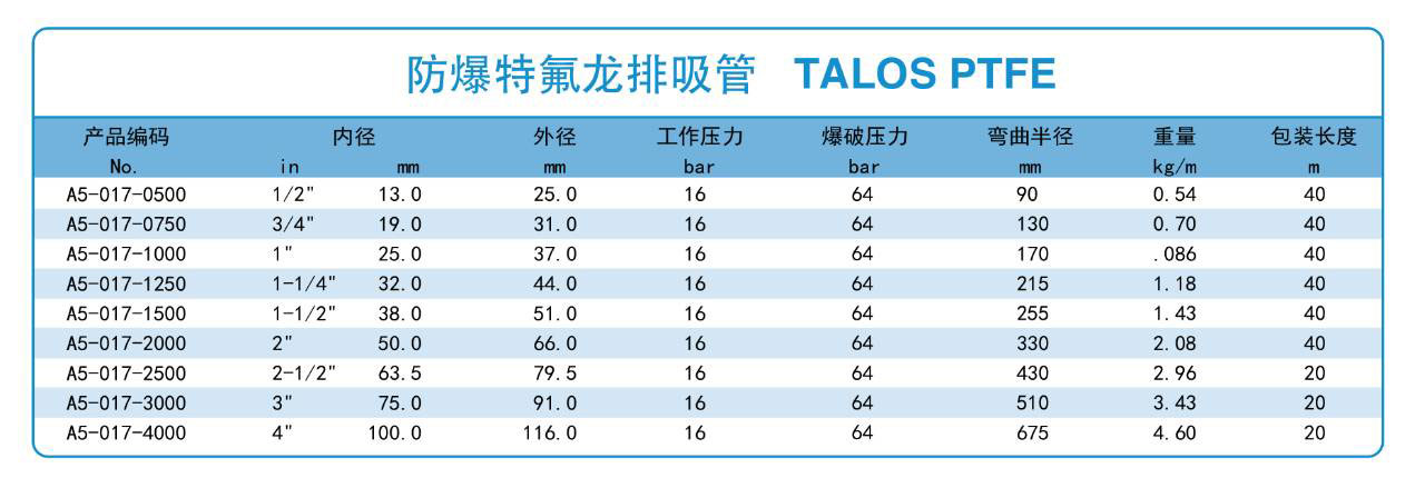 TALOS PTFE是一款符合Ω/T(高安全需要)的軟管,通過了ATEX認(rèn)證,可用于防爆要求的環(huán)境。其內(nèi)膠材質(zhì)是防靜電PTFE,含有少量特殊“高純度”炭黑材料。它可以使原本不導(dǎo)電的特氟龍實現(xiàn)安全釋放介質(zhì)產(chǎn)生的靜電,并且不會被剝離出來污染介質(zhì),符合FDA、USP等相關(guān)國際標(biāo)準(zhǔn)。