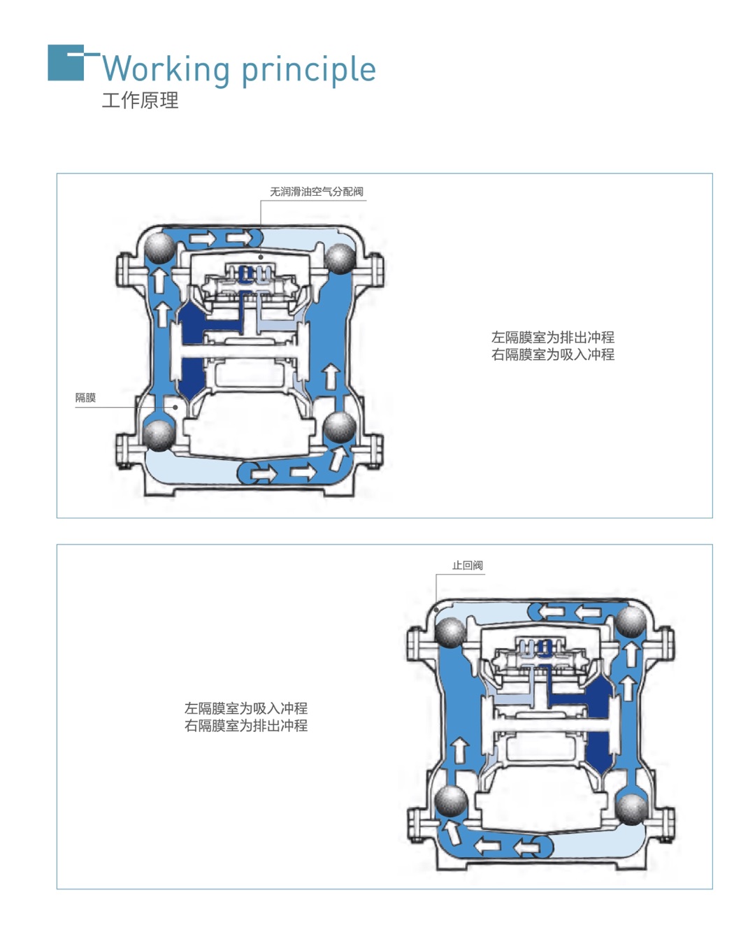 定向空氣分配閥和主氣閥稱為“氣室”,都設置在中心位置,介質流動通過兩個匯流和泵的外隔膜室,成為“介質室“。通常,止回閥(閥球)設置在每個隔膜室的頂部和底部通常共用一個匯流管。這兩個外隔膜室進料口與出料口連接起來,泵是自吸的。